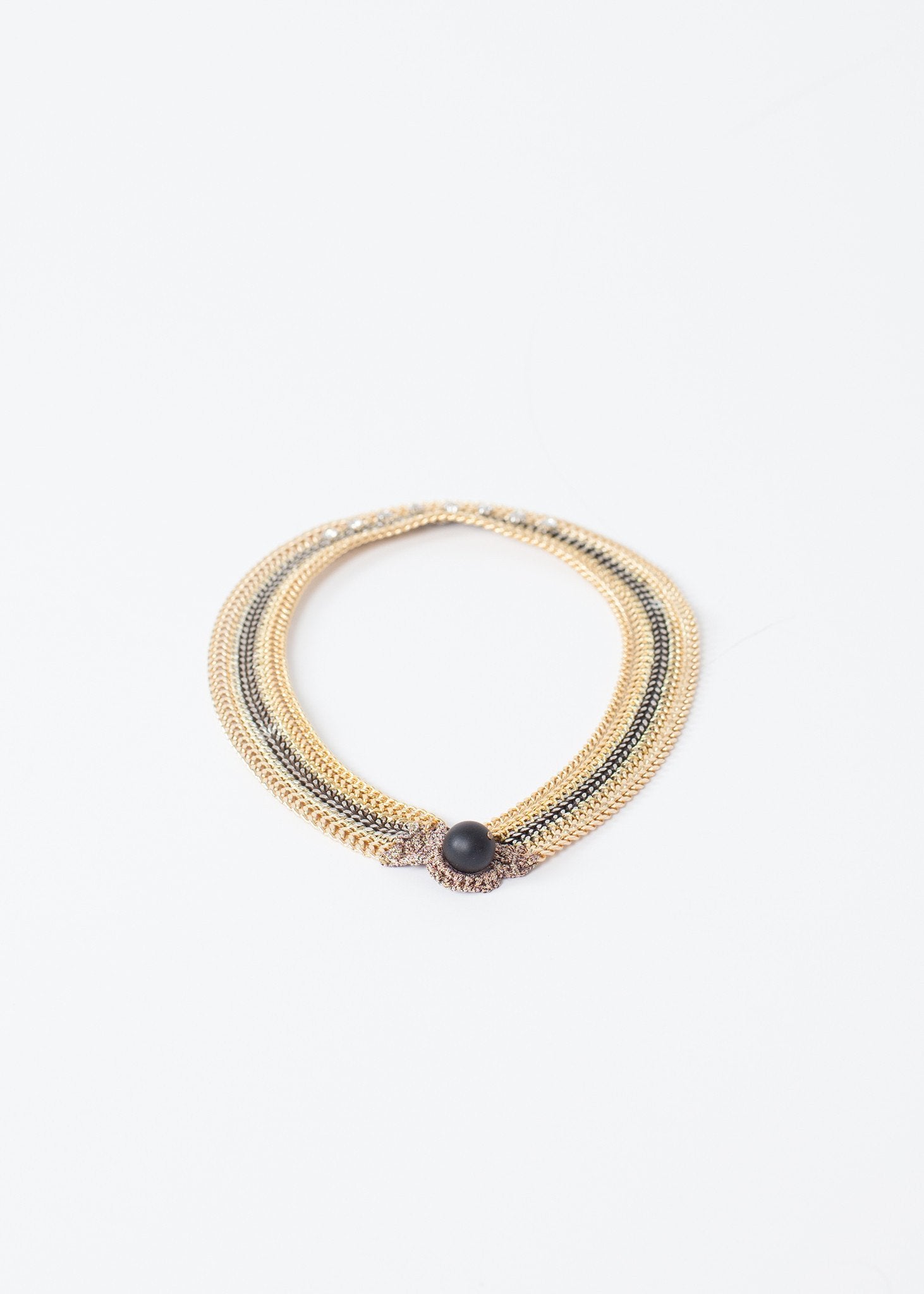 Quintessential elegance with delicate details. The statement collar necklace intertwines gems and mixed metals. Hook and ball closure. 5 Octobre. Color Grey. Gold Plated. Made in France.
