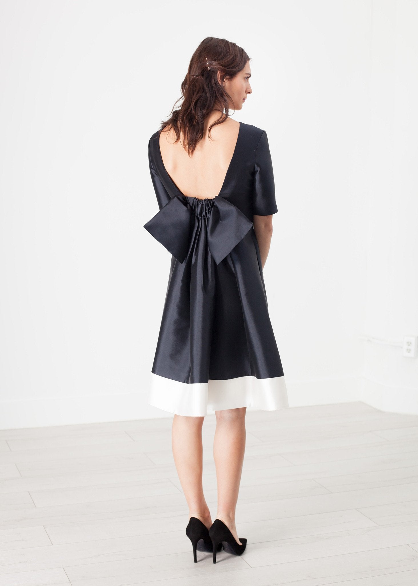 Harvey Faircloth's Tie Dress adds a 1950's elegance to one's day. With princess seaming and a clean neckline, an unfussy look takes shape. Delicate tie detail at back with slight low back. Hidden side pockets. Invisible zip fastener at side. Fully lined. Color Navy. 51% Silk, 49% Wool, 100% Silk. Made in U.S.A. Lana is wearing a Size 2.