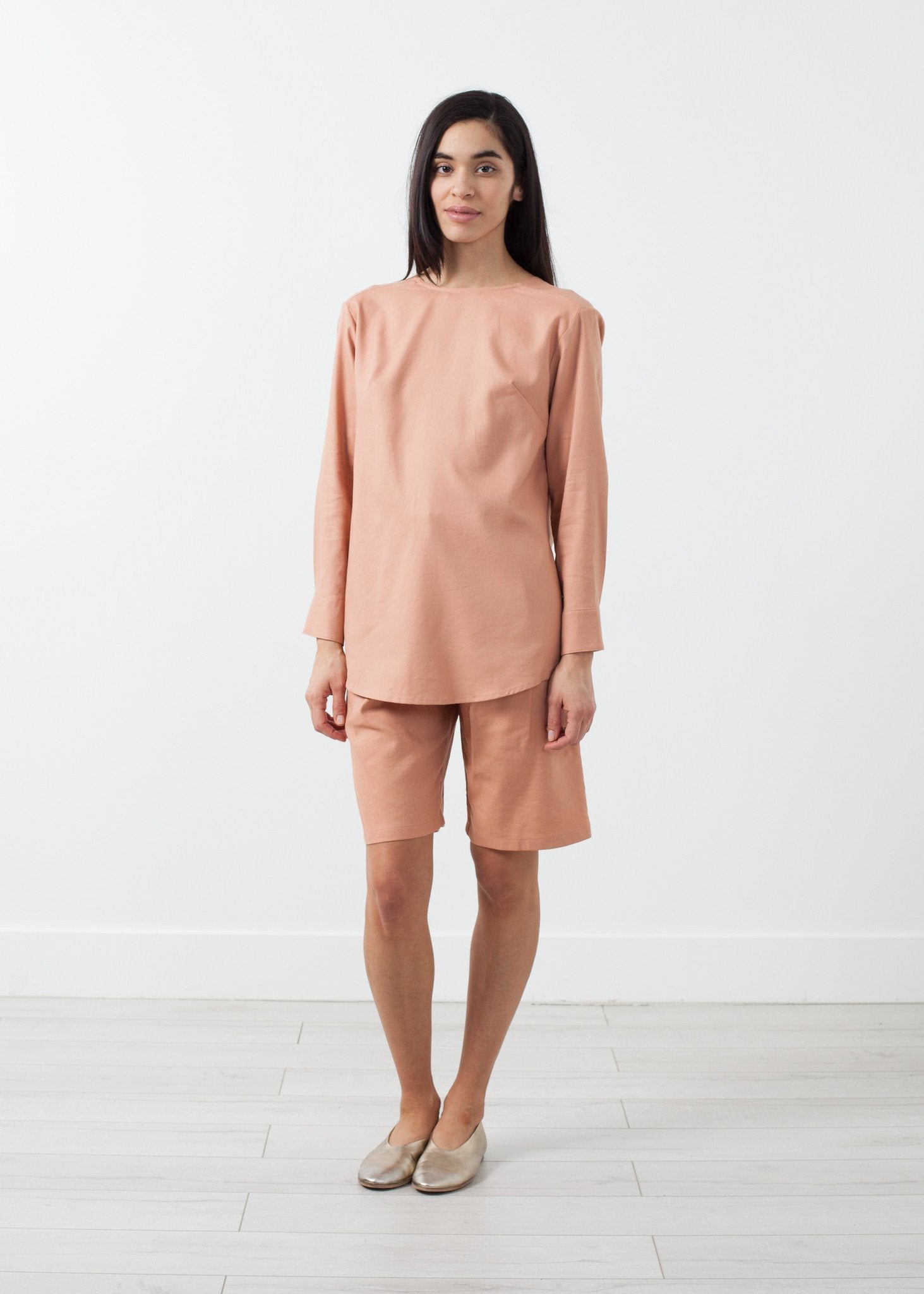 Spring forward with glorious enthusiasm for summer with Jesse Kamm's ACB Top. The line is charming and easy, with hints of nautical inspiration. Open back with V. Button placket closure at center back. Color Brick. 45% Tencel, 40% Cotton, 15% Flax. Made in U.S.A. Ashley is wearing an X-Small.